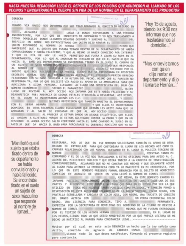 Supimos que Hernán Albarenque se vio involucrado en una tragedia, aunque se supone que esto solo se sabía entre el jurídico de la empresa, los altos mandos y la gente muy cercana a Hernán, pues en la televisora quisieron ocultarlo todo (...) En la televisora nos enteramos que había sido detenido por la Policía porque habían encontrado a un hombre muerto en su departamento", reportó la fuente.