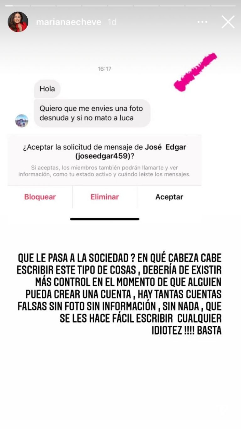Hola, quiero que me envíes una foto desnuda y si no mato a Lucca", se leía en la brutal amenaza que le hicieron a la presentadora y la cual exhibió en sus redes.