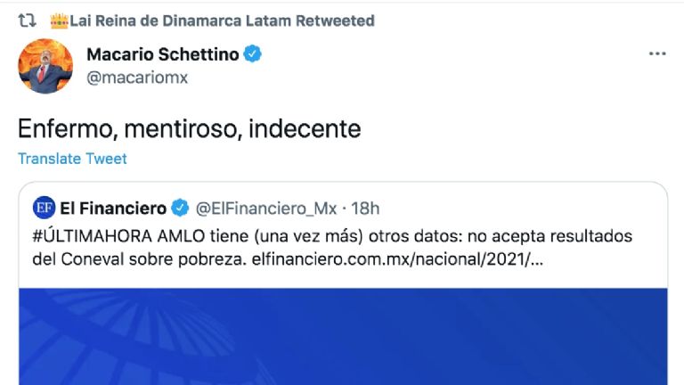 Incluso, la actriz retuiteó un mensaje en el que llamaban "enfermo, mentiroso, indecente" al tabasqueño, dejando más que clara su postura sobre las últimas polémicas del mandatario.