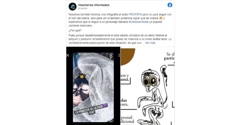 Podemos lograr que se viralice y esperamos que le llegue a un personaje llamado Christian Nodal, un popular cantante mexicano. ¿Por qué? Pues porque desafortunadamente él está siendo cómplice de un delito federal al adquirir y presumir recientemente que posee de mascota a un moño araña bebé", escribió en su página de Facebook.
