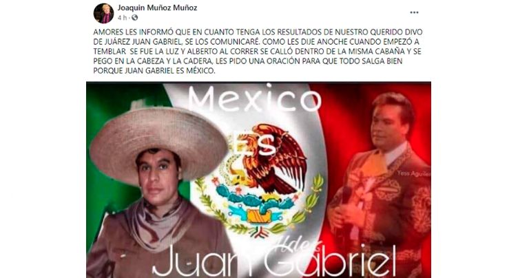 Amores, les informo que en cuanto tenga los resultados de nuestro querido 'Divo de Juárez', Juan Gabriel, se los comunicaré. Como les dije anoche, cuando empezó a temblar se fue la luz y Alberto, al correr, se cayó dentro de la misma cabaña y se pegó en la cabeza y la cadera. Les pido una oración para que todo salga bien, porque 'Juan Gabriel es México', detalló.