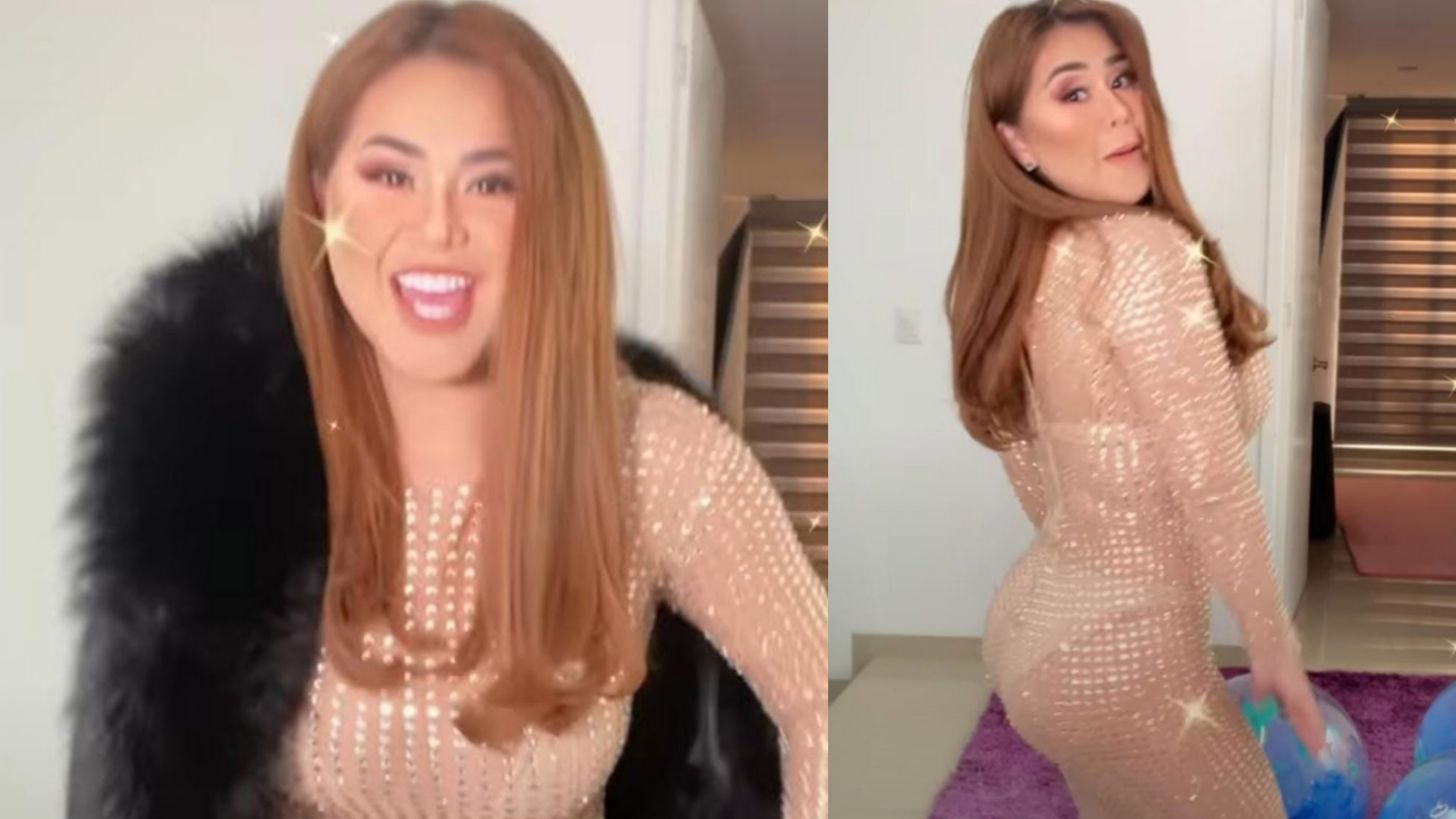 En el video se observa a la youtuber y payasita bailando al ritmo del éxito de reggaetón Problemón de Álvaro Díaz y Rauw Alejandro mientras lleva un camisón dorado que combinó con cinturón, chaqueta y botas de color negro, el cabello suelto con ondas y maquillaje que resaltó su belleza.
