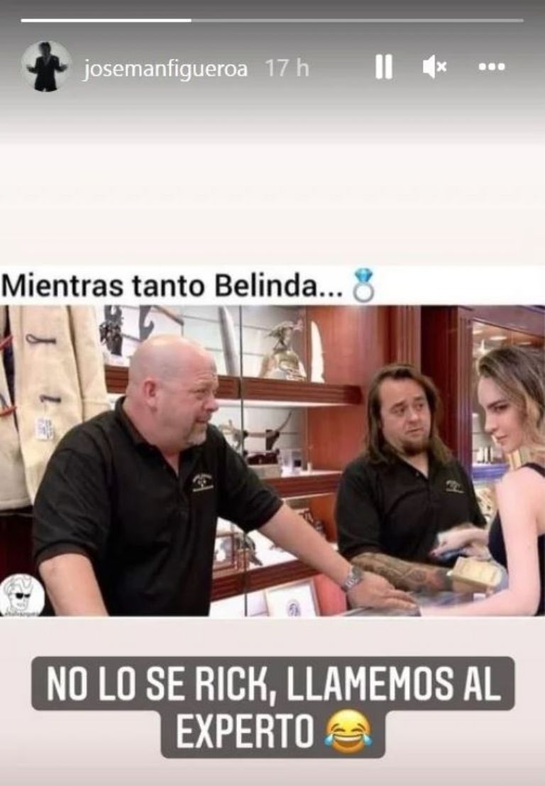 José Manuel Figueroa, quien sostuvo un tórrido romance con Ninel Conde, y hasta anillo de compromiso hubo, compartió un meme en sus historias de Instagram alusivo a lo que Belinda hará con la joya valuada en 3 millones de dólares.