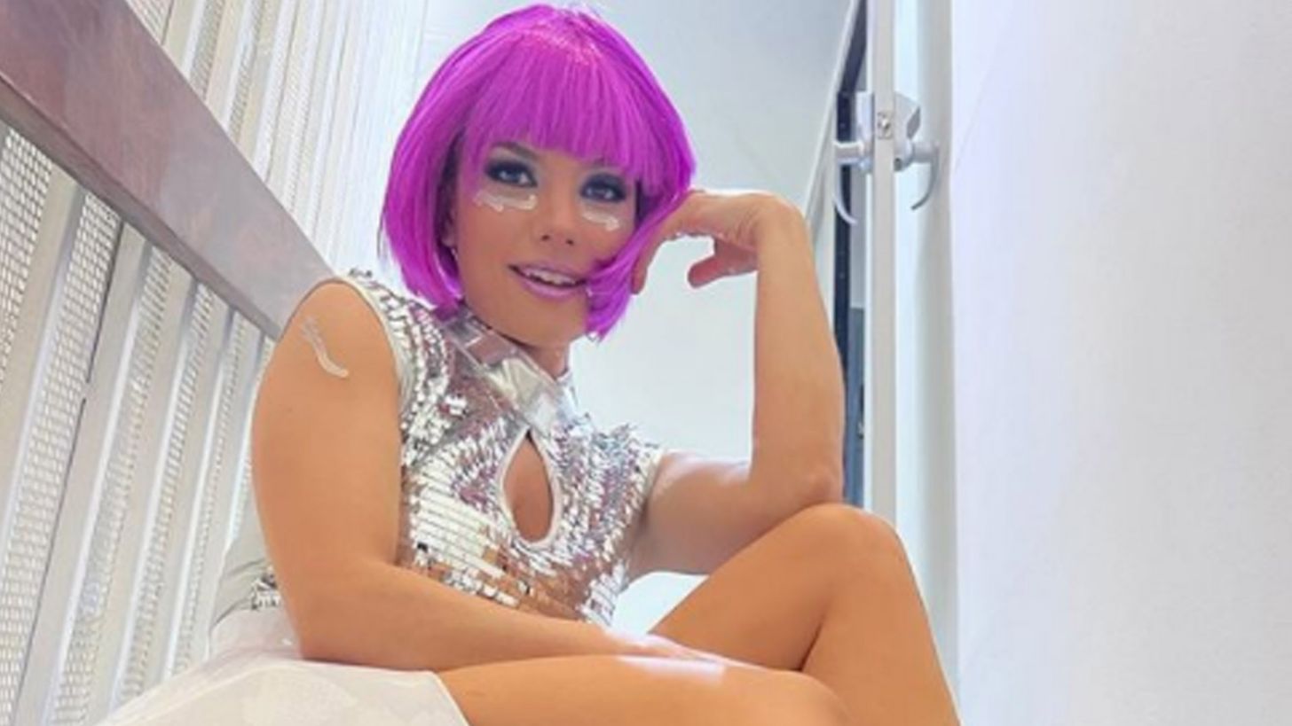 Para su show, la mujer de 42 años modeló un pequeño top de color negro, un short morado y medias de red con las que permitió ver sus torneadas piernas, unas combat boots, accesorios plateados y el cabello recogido en una coleta.
