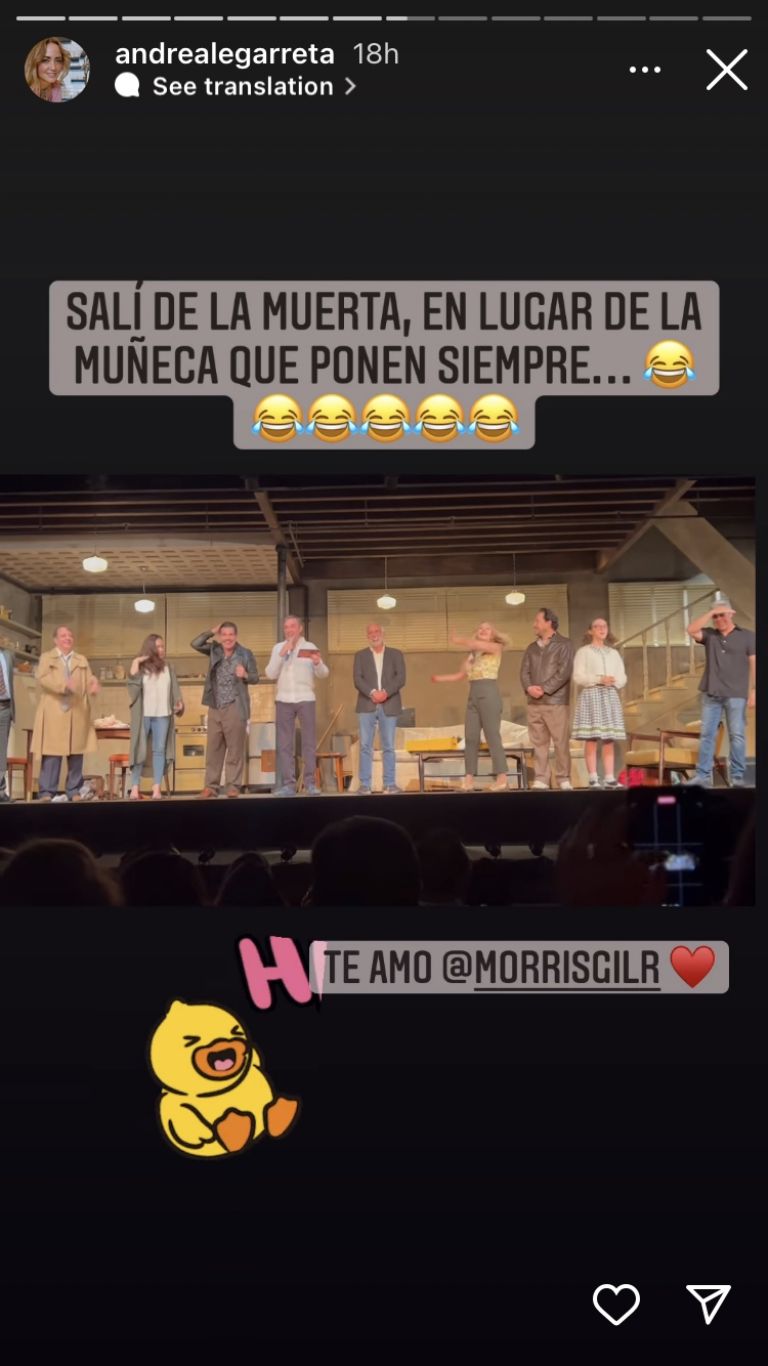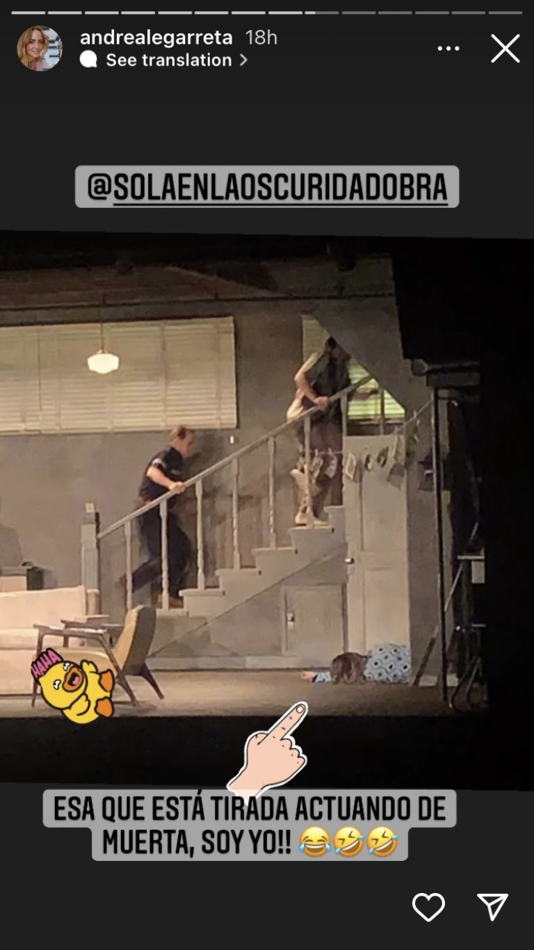 Esa que está tirada actuando de muerta, soy yo (...) salí de la muerta en lugar de la muñeca que ponen siempre", escribió la conductora junto a emojis de risa, mientras que Nina le escribió: "Ma, qué gran actuación, te llevaste la obra jajaja".