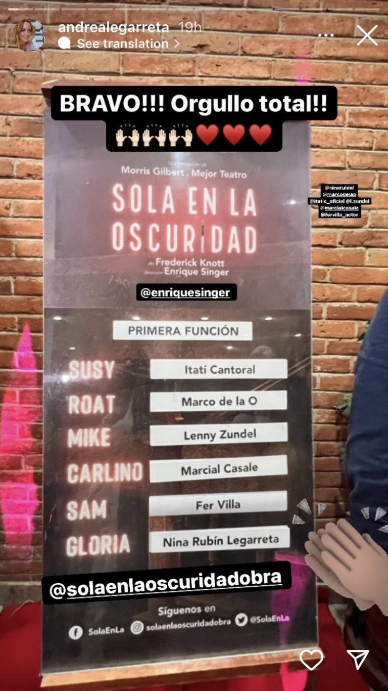 Y esque este fin de semana acudió a ver la puesta en escena protagonizada por Itatí Cantoral en la que actúa su hija Nina Rubín. A través de sus historias de Instagram presumió la gran noche que pasaron en familia, pus estuvo acompañada de Erik Rubín y su hija mayor Mía.