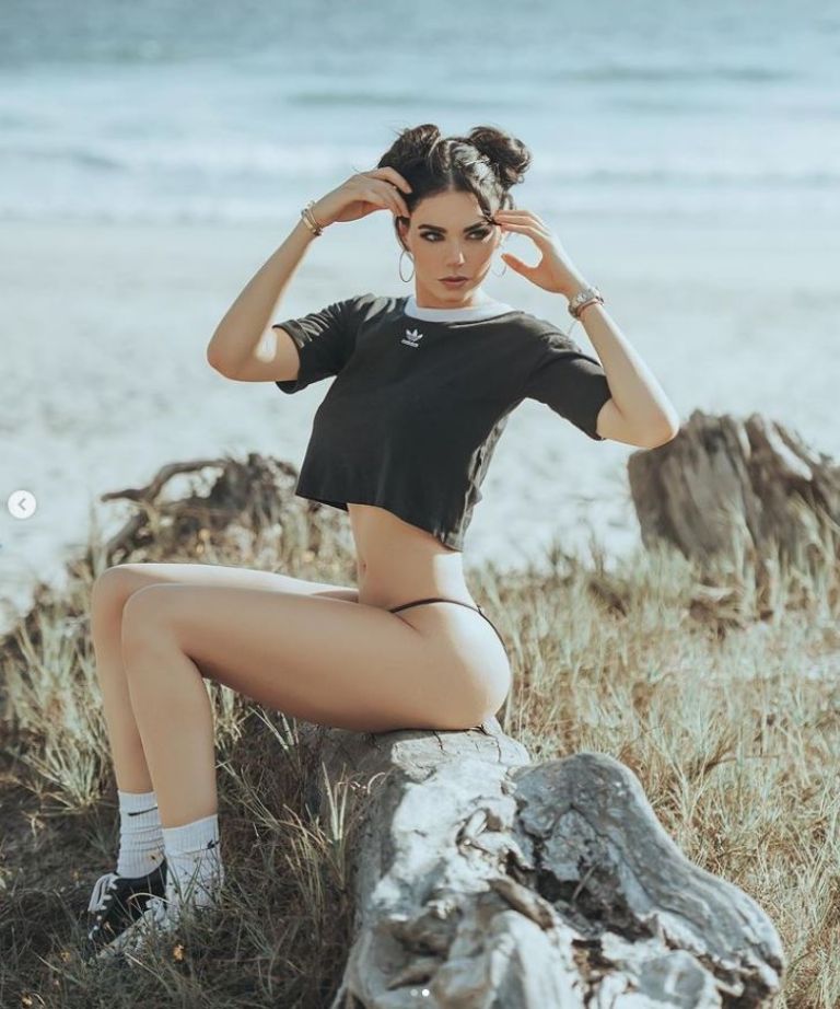 En una de las instantáneas, la estrella de La Desalmada, posa sentada sobre un tronco mientras lleva puesto una holgada camiseta negra y unos tenis del mismo color, sin embargo, lo que más llamó la atención de sus enamorados fue el diminuto bañador con el que lució su mini cintura.