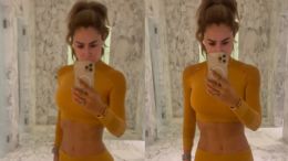 En esta ocasión la reconocida artista de 45 años apareció luciendo un ajustado short de polipiel en color azul claro con el que dejó ver sus torneadas piernas, un top de mangas largas con el cual dejó ver su plano abdomen, el cabello peinado con ondas y accesorios dorados.