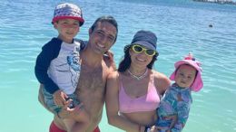 La exreina de belleza posó desde una playa en Las Bahamas mientras lleva un coqueto bañador de dos piezas de color verde con estampado de caritas felices que hacía 'match' con el de toda su familia.