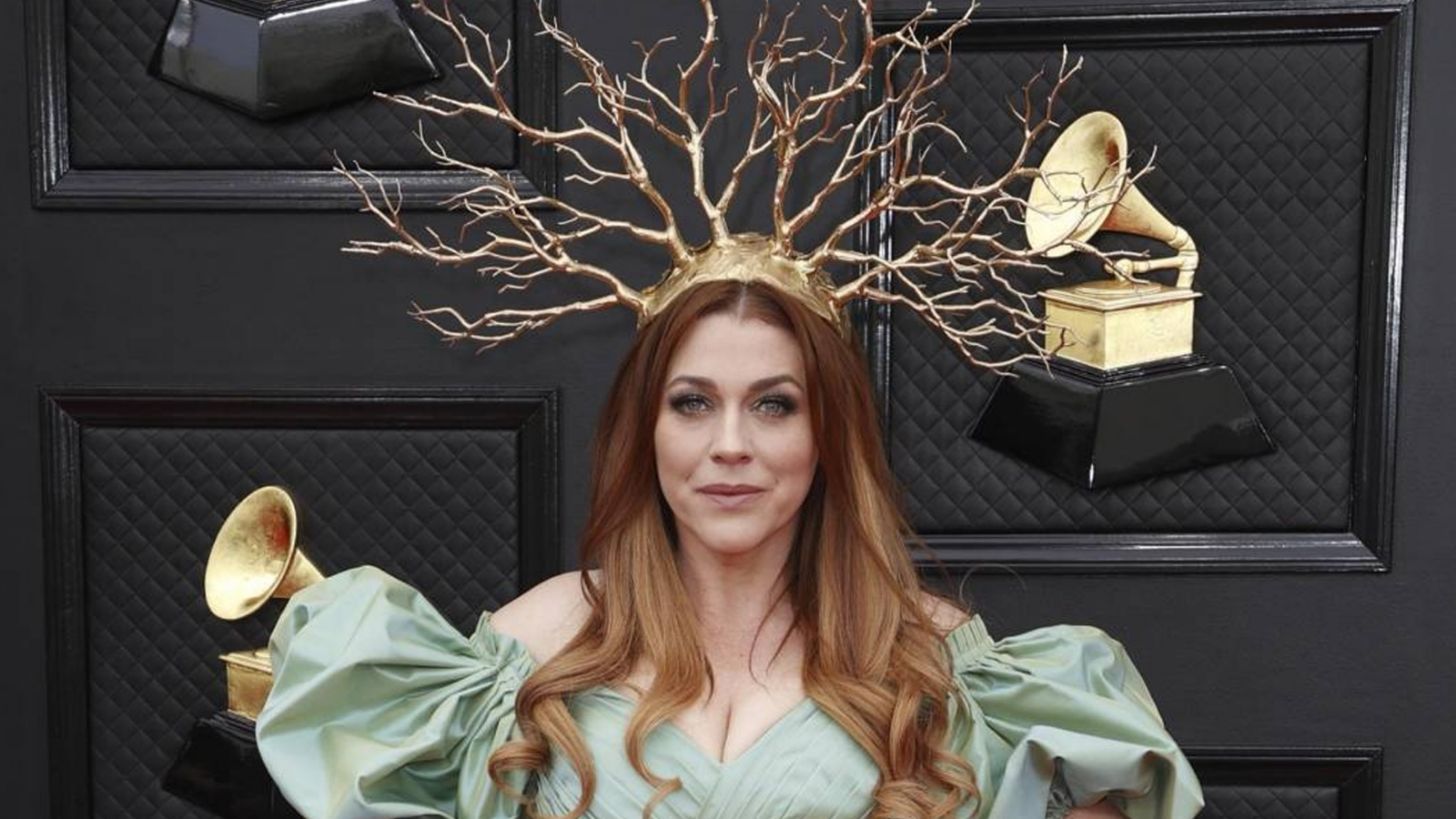 La actriz Alisha Gaddis se paseó por la alfombra con un vestido verde y un excéntrico tocado dorado con forma de ramas de árbol.