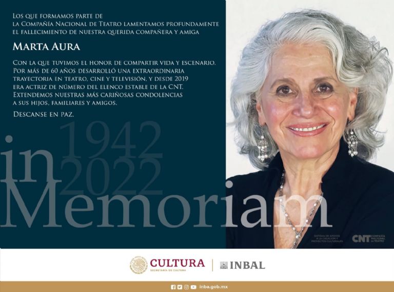 Ciudad de México.- A los 83 años falleció la actriz Marta Aura Palacios, mejor conocida como Marta Aura, confirmaron la Compañía Nacional de Teatro y el Instituto Nacional de Bellas Artes y Literatura (Inbal) por medio de Twitter; por su parte, la Secretaría de Cultura también lamentó el fallecimiento de Aura y destacó los más de 60 años de trayectoria profesional de la actriz. La mujer nacida en la Ciudad de México participó en festivales de canto y teatro desde muy pequeña, pero fue en la adolescencia que descubrió su pasión por la actuación.