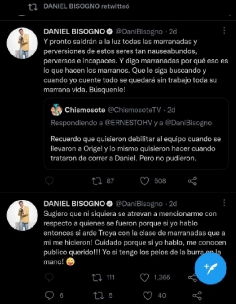 Sugiero que ni siquiera se atrevan a mencionarme con respecto a quien se fueron, porque si yo hablo, entonces sí arde Troya con la clase de marranadas que a mí me hicieron", tuiteó.