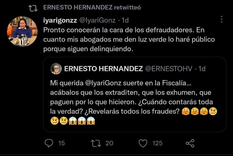Mi querida Iyari suerte en la Fiscalía… acábalos, que los extraditen, que los exhumen, que paguen por lo que hicieron. ¿Cuándo contarás toda la verdad? ¿Revelarás todos los fraudes?", dijo Hernández, mientras que la productora del programa de espectáculos respondió "¡Así será!" y adjuntó una fotografía de las instalaciones de la Fiscalía: "Pronto conocerán la cara de los defraudadores. En cuanto mis abogados me den luz verde lo haré público porque siguen delinquiendo".