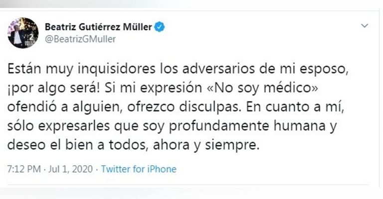 Ciudad de México.- Beatriz Gutiérrez Müller, la esposa del presidente de México, Andrés Manuel López Obrador, mediante su cuenta de Twitter, pidió disculpas por la respuesta que dio a un tuit cuando fue cuestionada por no atender a los padres de niños que padecen cáncer.