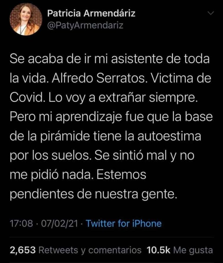 Se acaba de ir mi asistente de toda la vida. Alfredo Serranos. Víctima de Covid. Lo voy a extrañar siempre. Pero mi aprendizaje fue que la base de la pirámide tiene la autoestima por los suelos. Se sintió mal y no me pidió nada. Estemos pendientes de nuestra gente", fue el mensaje que compartió.