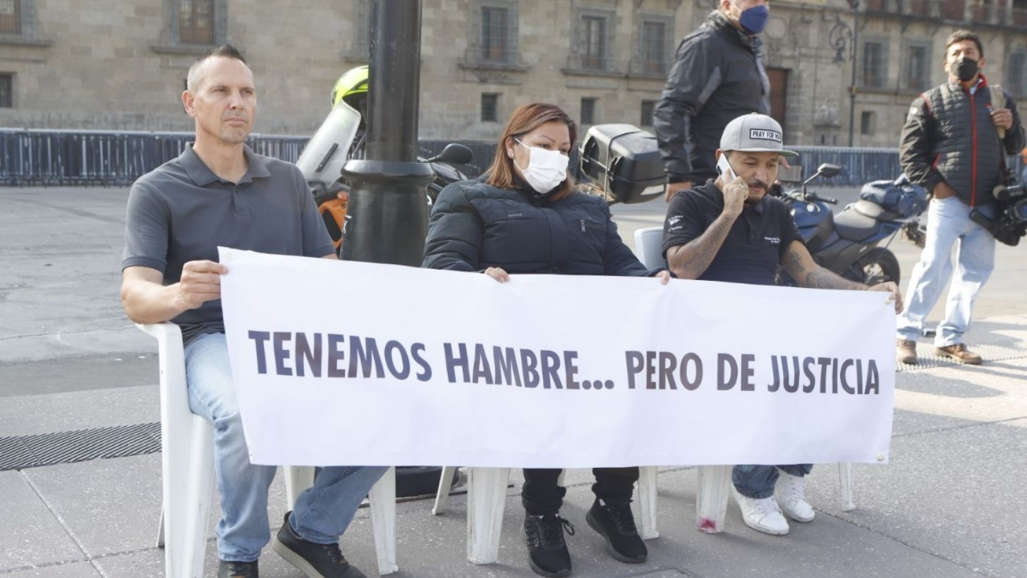 Ambos se colocaron frente a la puerta central de Palacio Nacional, junto con Itzel del Carmen, esposa de Valdovinos, con una manta con la frase "Tenemos hambre… pero de justicia", en espera de ser escuchados por el presidente AMLO.