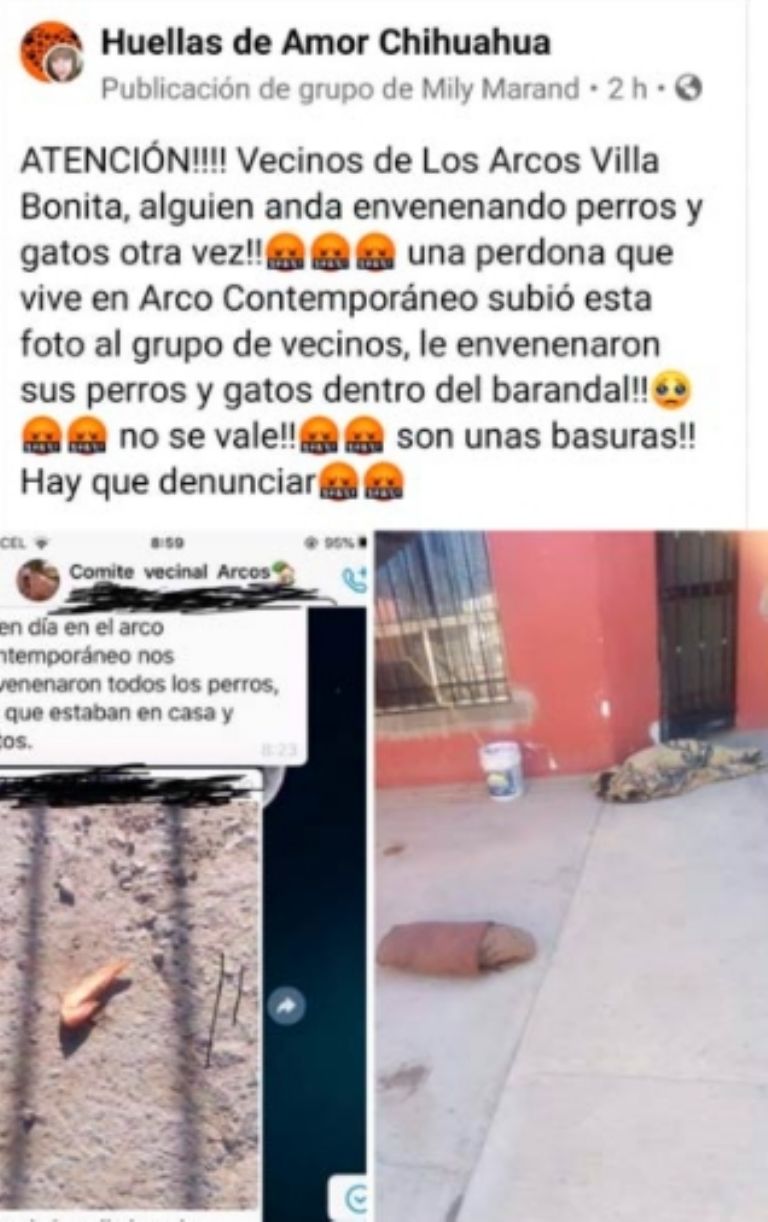 Chihuahua.- Perros y gatos aparecieron muertos en la colonia Los Arcos Villa Bonita, en Chihuahua, y al lado de los cadáveres estaban restos de pollo, por lo que se presume que los envenenaron.