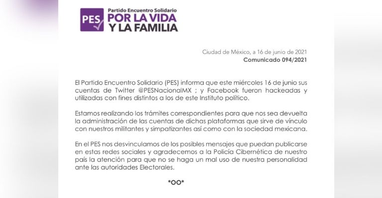 Ciudad de México.- Autoridades del Partido Encuentro Solidario (PES) emitieron un comunicado en el cual informaron que sus diversas redes sociales fueron víctimas de un 'hackeo', por lo que descartan que ellos fueron quienes hicieron esas publicaciones pro aborto y sobre la diversidad sexual.