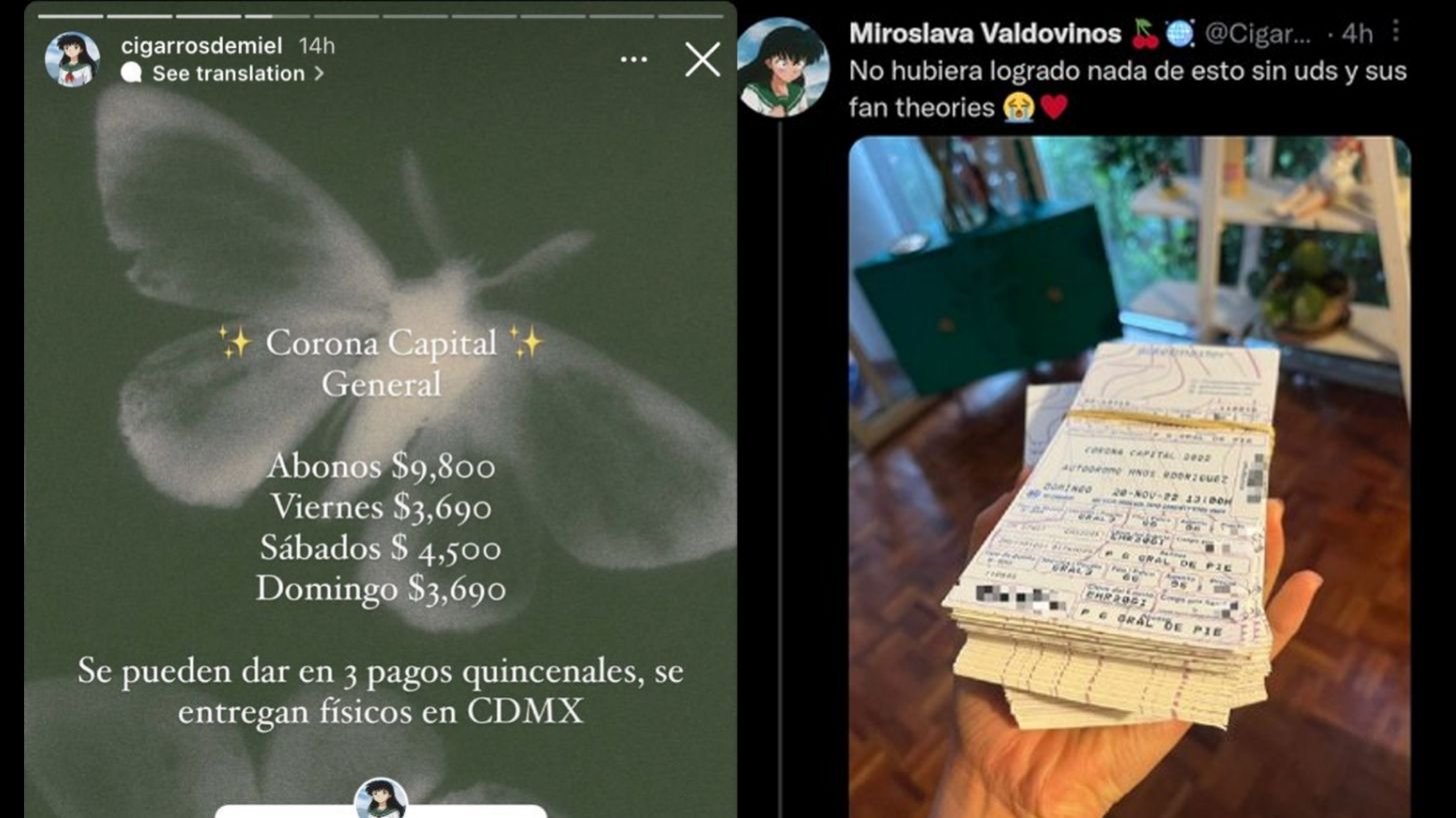 Ciudad de México.- Hace unos días en redes sociales la usuaria Miroslava Valdovinos (@CigarrosDeMiel) desató una polémica en Internet luego de que diversos cibernautas denunciaran la reventa de boletos para el evento Corona Capital, pues no sólo los ofrecía hasta el triple de su costo original, sino que presumió tener 108 boletos listos para entregarse en algún punto de la Ciudad de México, al respecto, la empresa de venta de boletos Ticketmaster negó tener algún tipo de relación con ella, hasta aseguró no conocerla.