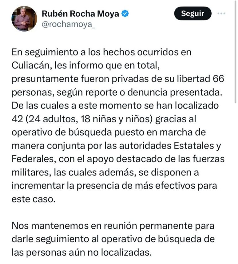 Hasta la publicación de esta nota se ha confirmado, preliminarmente, 66 víctimas; 42 de ellas liberadas, y entre estas, 18 menores de edad. Niños y niñas, inmersos en una violencia desbordada. Tal es la crisis, que la Fiscalía General de Sinaloa cifra que todos los días se presentan, por lo menos, 2 denuncias por desaparición. Del total la mitad ocurre en Culiacán.
