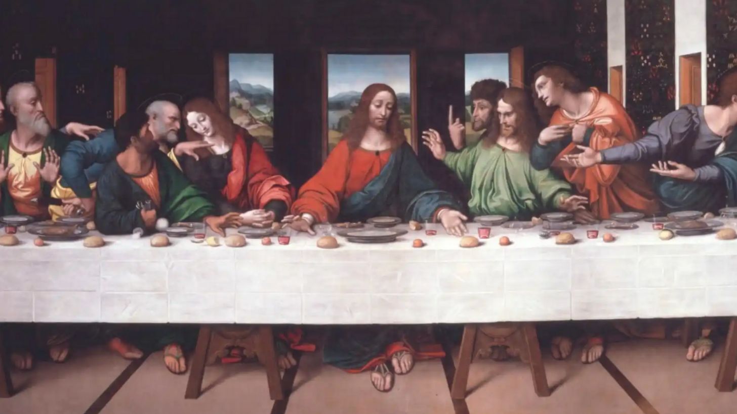 Siguiendo la tradición judía, Jesús se reunió con sus apóstoles para compartir el pan y el vino en medio de una cena solemne, la cual solía ser vista como una acción de agradecimiento hacia el creador. Como es bien sabido, el pan que consumen no tiene levadura y lo comen entre todos. Es en esta cena donde el mesías menciona que uno de los presentes planea traicionarlo. Dicha situación desata que todos se cuestionen quién sería capaz de vender al hijo de Dios.