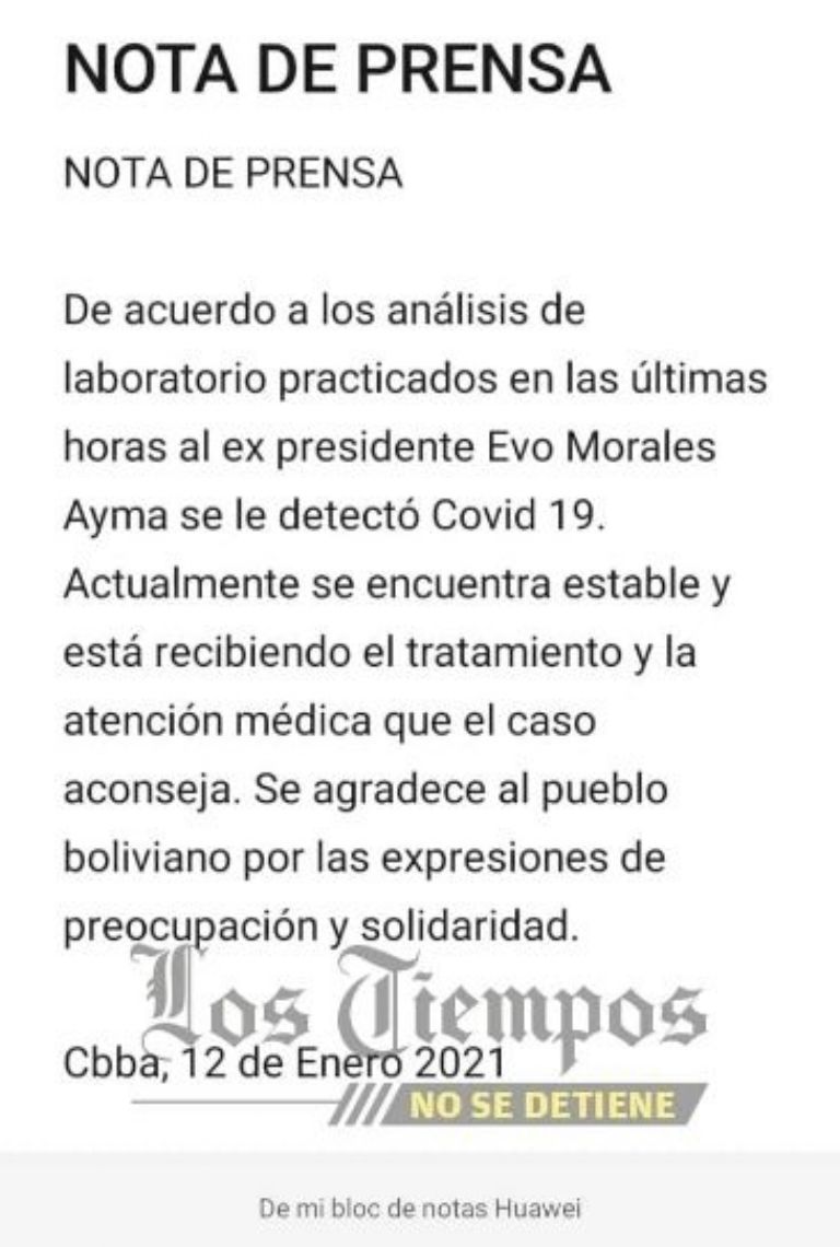 De acuerdo a los análisis de laboratorio practicados en las últimas horas al expresidente Evo Morales Ayma, se le detectó covid-19. Se agradece al pueblo boliviano por las expresiones de preocupación y solidaridad”, señala el texto.