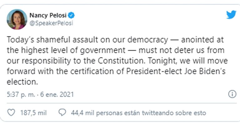 Muchos episodios de desencuentro entre Pelosi y el mandatario, han sido del dominio público; por esta razón no es de extrañarse que la legisladora describiera a Trump como una persona muy peligrosa que no debería continuar en el cargo. Mientras tanto, la demócrata señaló que la destitución del aún presidente de Estados Unidos es urgentemente importante, por lo que solicitó al vicepresidente Mike Pence y a todo el gabinete a invocar la 25ª Enmienda de la Constitución