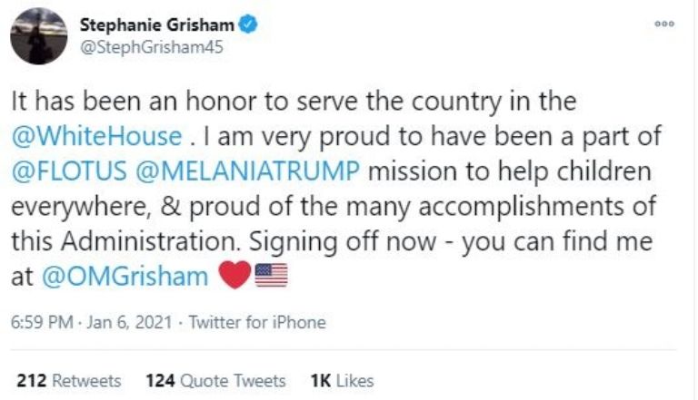 Ha sido un honor servir al país en la Casa Blanca. Estoy muy orgullosa de haber sido parte de @FLOTUS @MELANIATRUMP, misión de ayudar a los niños en todas partes y orgullosa de los muchos logros de esta Administración. Ahora puedes encontrarme en @OMGrisham".
