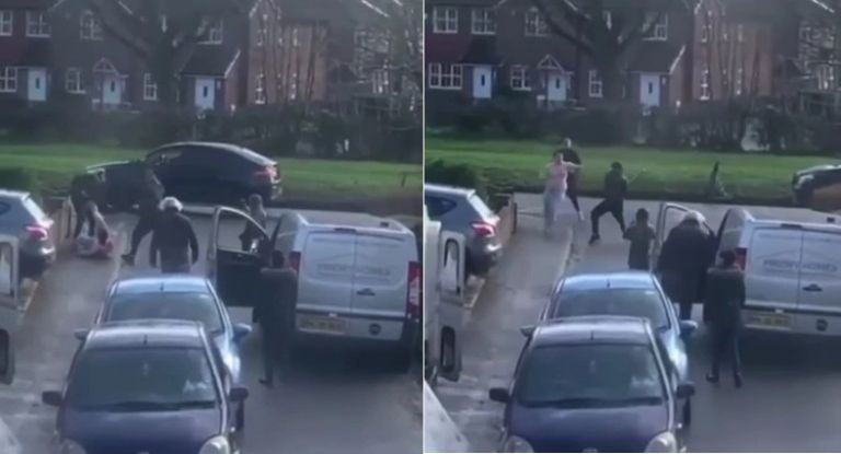 Una mujer grita mientras los matones continúan con su violento ataque. Mientras tanto, se puede ver a otra mujer filmando el asalto, mientras un hombre mayor observa. Las fuentes dicen que el incidente, que ocurrió a plena luz del día y que fue un presunto ataque de venganza.