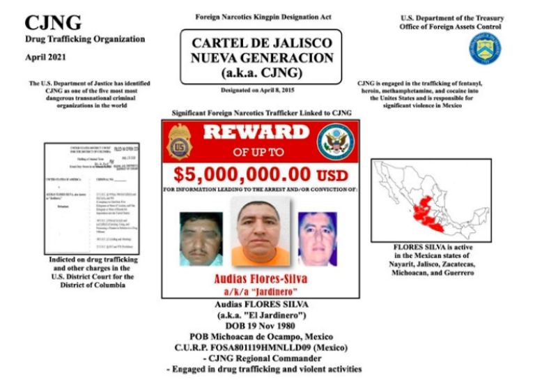 Washington, Estados Unidos.- Tras la fuga de Nemesio Oseguera Cervantes, alias 'El Mencho', quien era el líder del Cártel de Jalisco Nueva Generación (CJNG), el grupo delictivo quedó al mando de Audias Flores Silva, también conocido como 'El jardinero', 'Comandante' o 'El bravo 2', persona que recientemente fue declarada por el Gobierno de Joe Biden como "narcotraficante significativo", razón por la cual se ofrece una recompensa de cinco millones de dólares (mdd) para lograr su captura.