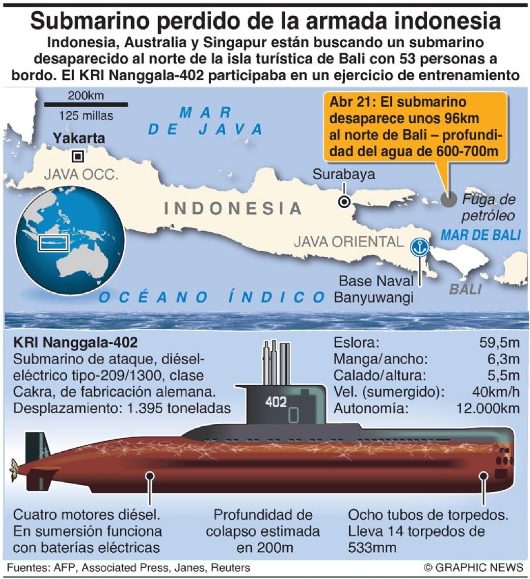 El submarino, uno de los cinco pertenecientes a las fuerzas armadas de Indonesia, se sumergió la mañana del miércoles durante los ejercicios militares previstos en el norte de la isla de Bali. El contacto se perdió poco después.