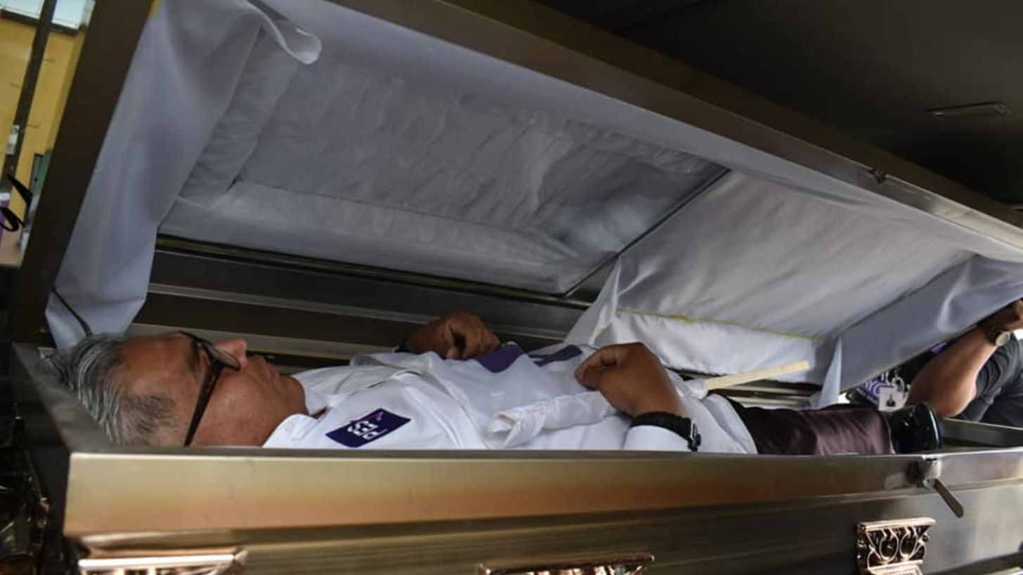 A quienes acudieron a escuchar su discurso les sorprendió que el candidato, Carlos Mayorga, se trasladara al punto de encuentro al interior de un féretro, por lo que grabaron el acto y lo difundieron en redes sociales.
