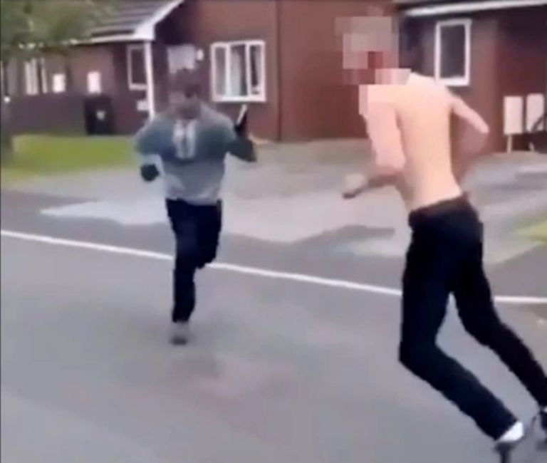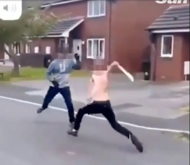 Lancs, Inglaterra.- Las fuertes e impactantes imágenes de dos hombres armados con machetes cortándose el uno al otro en una calle suburbana fueron filtradas, momento que fue visto por las familias.