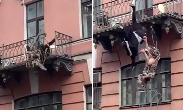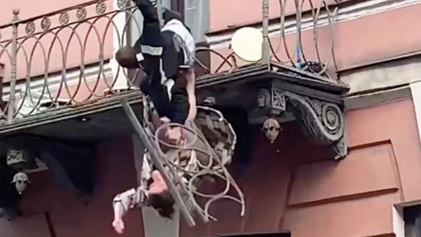 San Petersburgo, Rusia.- Este es el momento aterrador en que una pareja se cayó al pavimento desde el segundo piso de un balcón cuando estaban discutiendo durante la mañana.