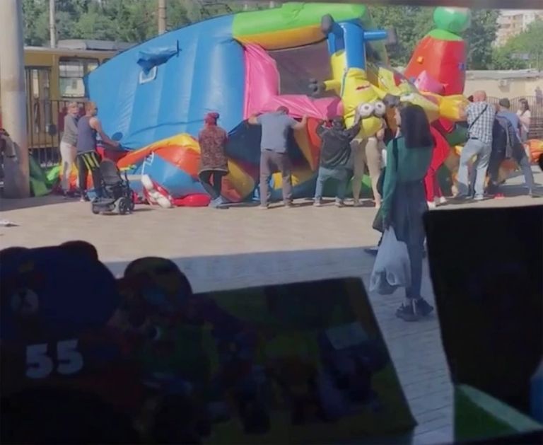 Un video filmado en el lugar del incidente muestra el pánico en la ciudad rusa de Barnaul cuando el inflable gigante arrancó sus amarras, arrojando a los niños por los aires.
