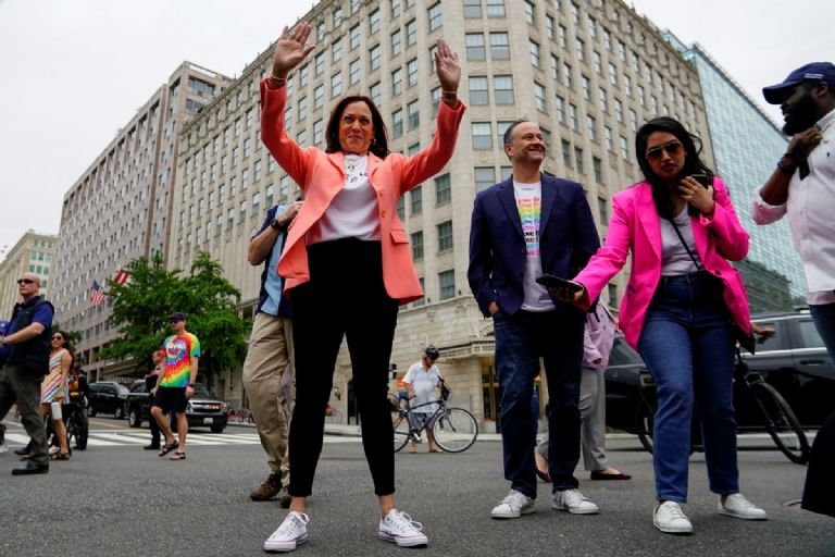 Con un saco rosa y una playera con el lema "Love is love", Kamala Harris se sumó a la marcha del orgullo realizada por una organización local de Washington junto a su esposo, Doug Emhoff.