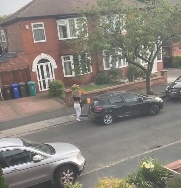 Se puede ver a la madre parada con aspecto agitado al costado de la callle en Manchester con su bebé. La abuela publicó las imágenes en las redes sociales en un intento por atrapar a los tres crimales. Ella dijo que su hija y su nieto están bien, pero "realmente conmocionados".