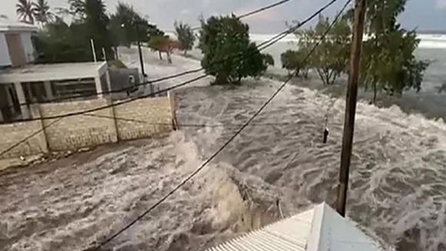 Las grandes olas golpearon casas y edificios ubicados en la primera línea de la playa e inundaron rápidamente las inmediaciones, según mostraron varios videos publicados en redes sociales. Afectados indicaron que el volcán entró en erupción a las 17:20 horas locales y lanzó una enorme nube de ceniza al aire.