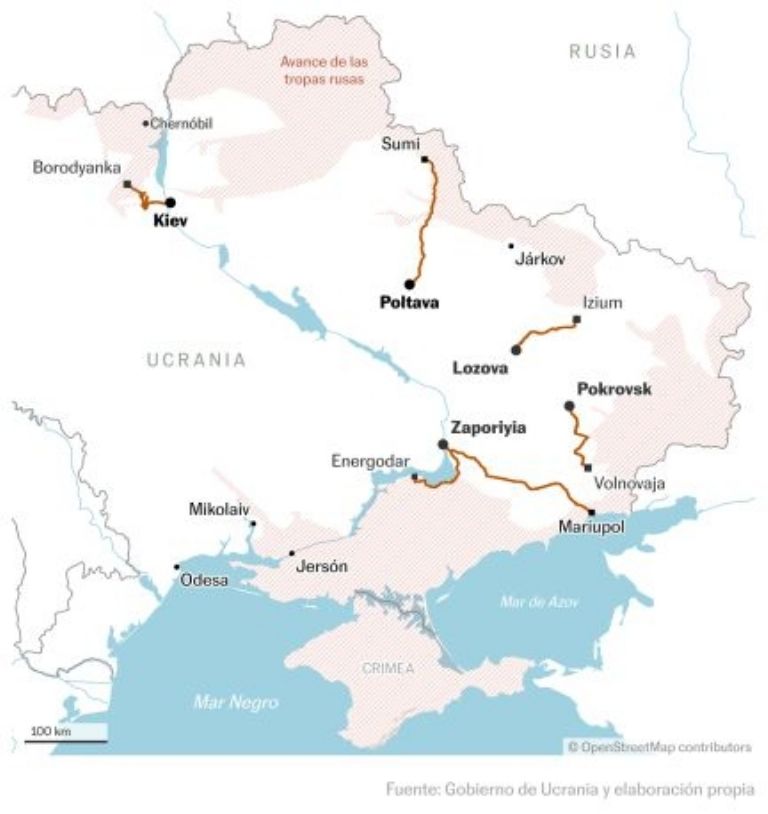 En ese sentido, las zonas para evacuar son: Energodar a Zaporiyia; Sumy hacia Poltava; Mariúpol a Zaporiye; Volnovaja con destino a Pokrovsk; y Pasas con rumbo a Lozova.