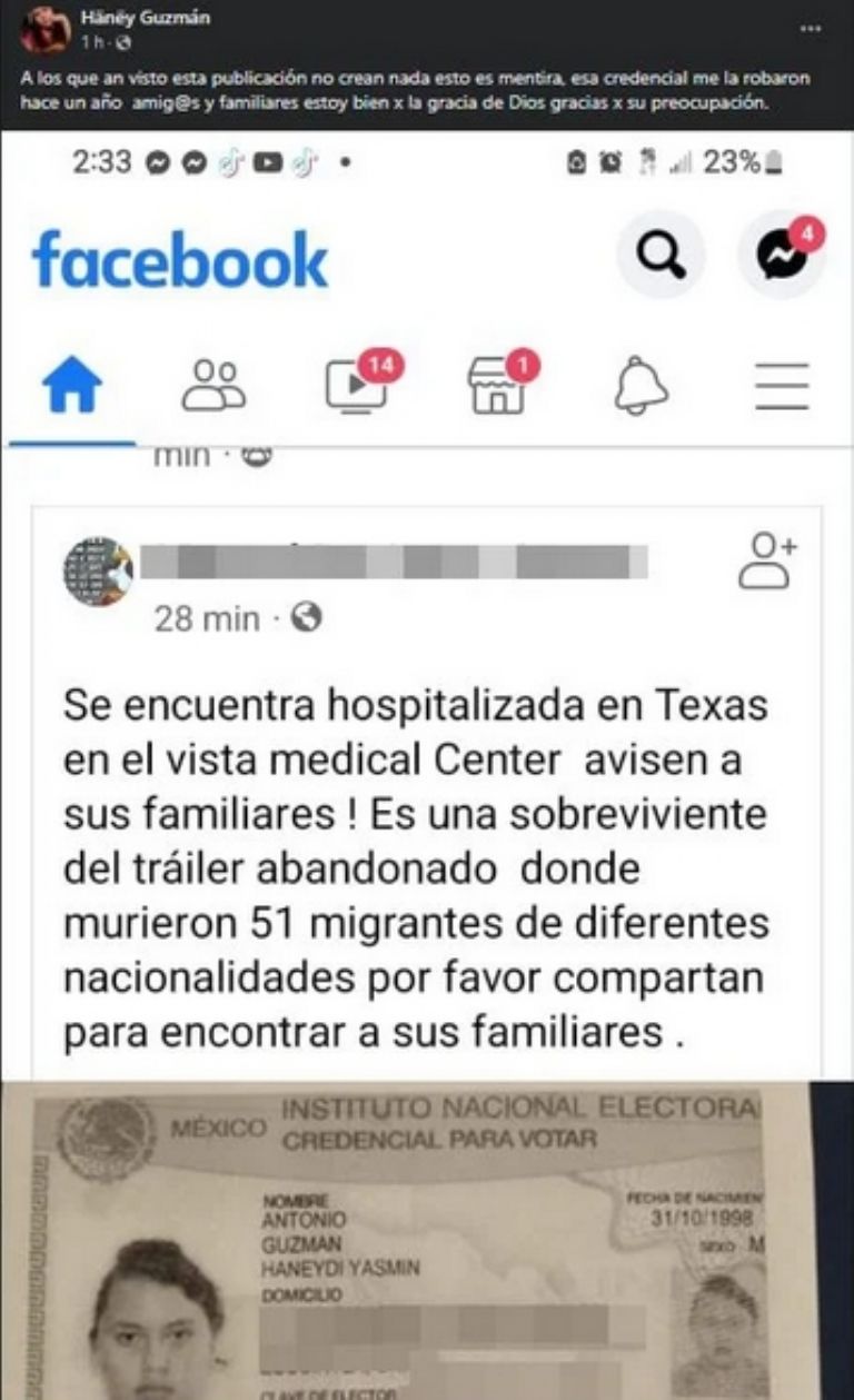 "A los que han visto esta publicación no crean nada esto es mentira, esa credencial me la robaron hace un año amig@s y familiares estoy bien por la gracia de Dios, gracias por su preocupación", expresó la joven, luego de que este martes 28 de junio se informaran las identidades de dos de los siete mexicanos que viajaban en el tráiler encontrado el lunes 27 por la tarde, con los cuerpos de 51 migrantes.