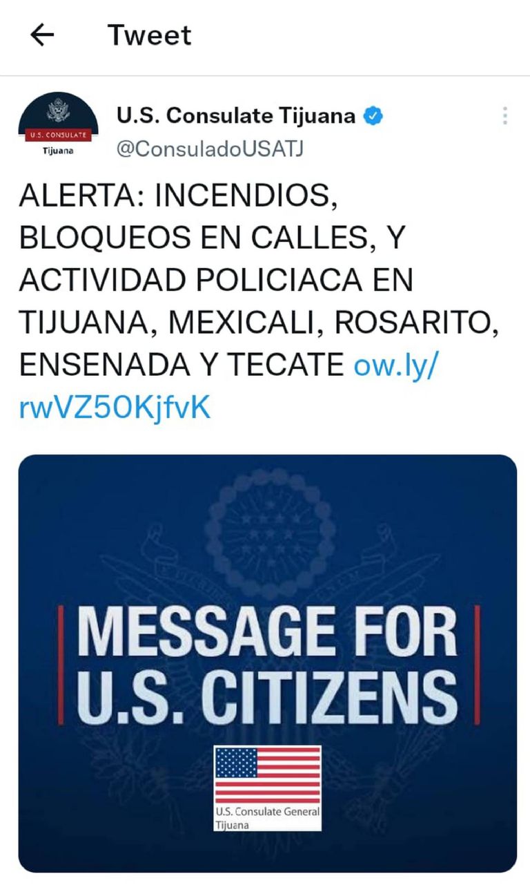 Se está al tanto de reportes de múltiples incendios a vehículos, bloqueos a calles, y fuerte actividad policiaca en Tijuana, Mexicali, Rosarito, Ensenada, Tecate. Se ha instruido a los empleados del gobierno de Estados Unidos que se mantengan resguardados en donde se encuentren hasta nuevo aviso", dice el comunicado; agregando el teléfono del Departamento de Estado – Asuntos Consulares: 1-888-407-4747 ó 1-202-501-4444.