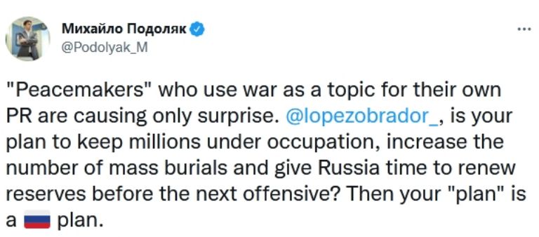 Los 'pacificadores' que usan la guerra como tema para sus propias relaciones públicas sólo causan sorpresa. López Obrador, ¿su plan es mantener a millones bajo ocupación, aumentar el número de entierros masivos y dar tiempo a Rusia para renovar las reservas antes de la próxima ofensiva? Entonces, su 'plan' es un plan ruso", aseveró Podolyak.
