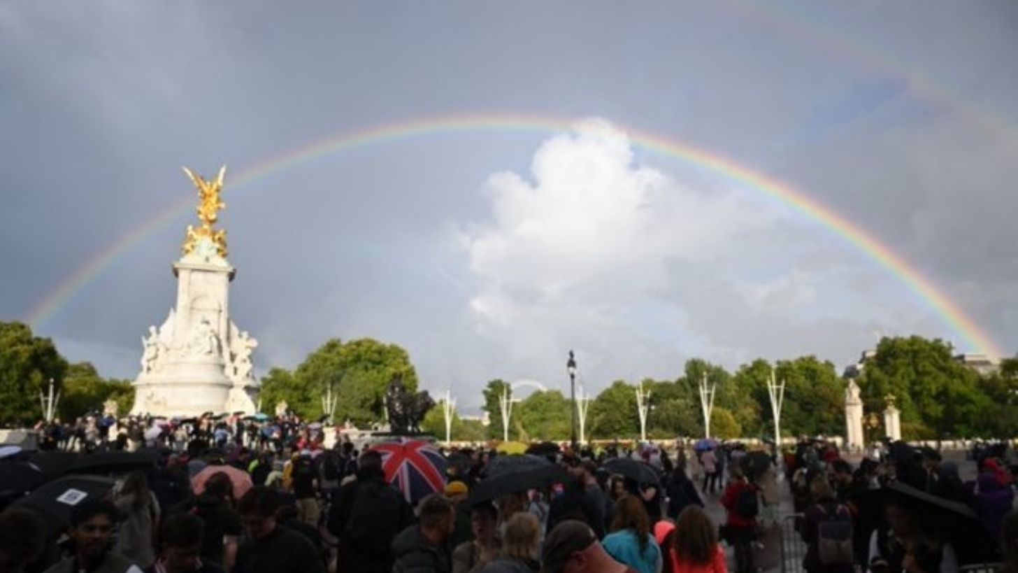 En el marco en que este evento cimbró al mundo, en las inmediaciones del Palacio de Buckingham cientos de seguidores de la reina cuyo mandato llegó a los 70 años, comenzaron a dejar flores y enviar buenos deseos pues esperaban que las noticias fueran reconfortantes. A pesar de la lluvia que suele envolver a Londres durante la mayoría del año, minutos antes de confirmase su deceso un arcoíris doble sacudió a la audiencia pues se dejó ver en su máximo esplendor por la Piccadilly Circus.
