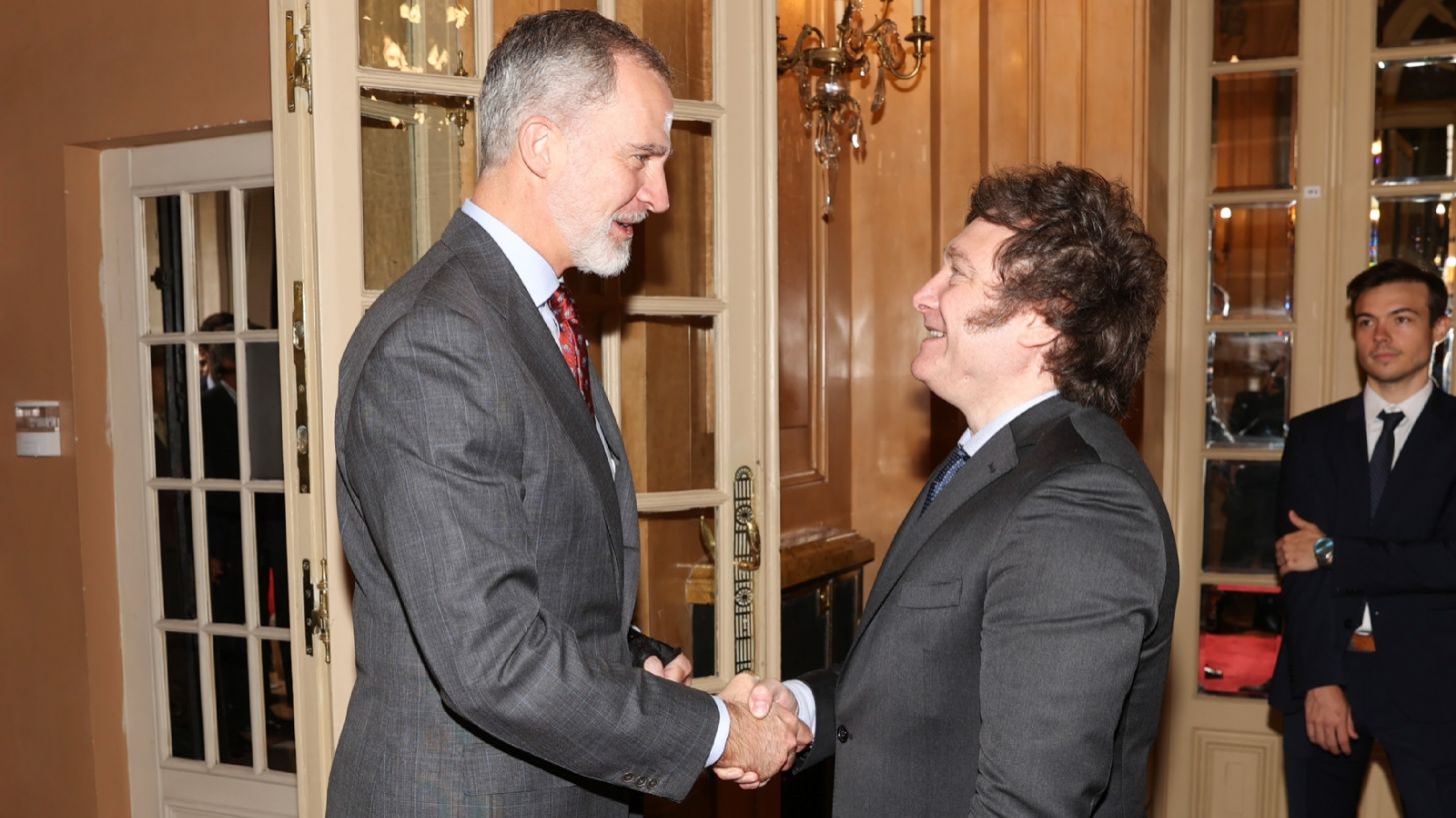 Buenos Aires, Argentina.- A tan solo un día de convertirse en presidente de Argentina de manera oficial, Javier Milei se reunió con el rey de España, Felipe VI en la sede del Ministerio Argentino de Relaciones Exteriores, Comercio Internacional y Culto. En ese sentido, el diplomático europeo llego al inmueble alrededor de las 13:00 horas (hora local). El objetivo del encuentro, de acuerdo con ambos gobiernos, fue con la intención de reforzar lazos.