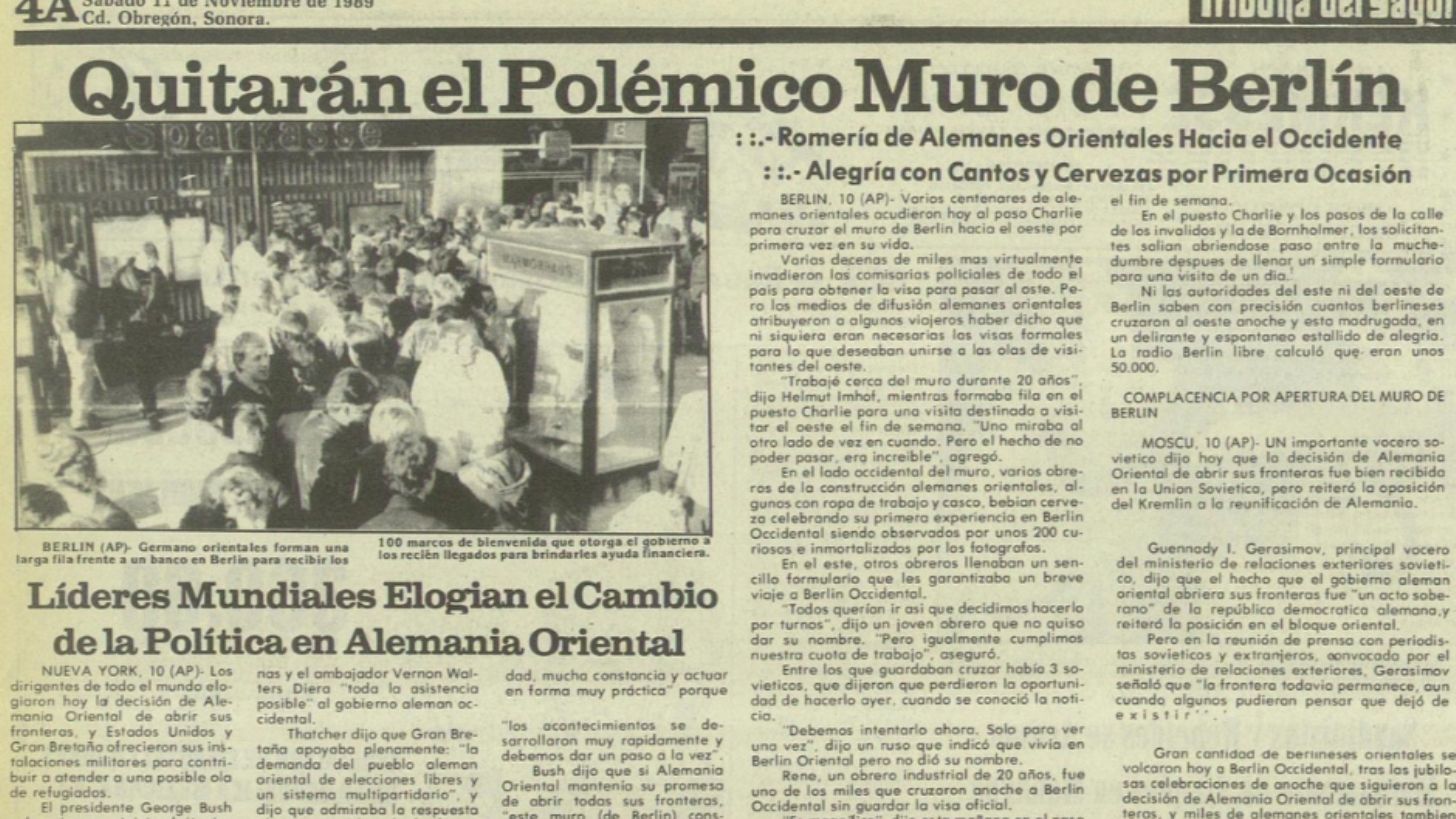 Ciudad Obregón, Sonora.- El 9 de noviembre de 1989 marcó un antes y después en la llamada 'Guerra Fría' que sostenían Estados Unidos y sus aliados ante la antigua Unión de Repúblicas Socialistas Soviéticas (URSS), con la caída del Muro de Berlín, la infame barrera que partía en dos a Alemania: La República Democrática