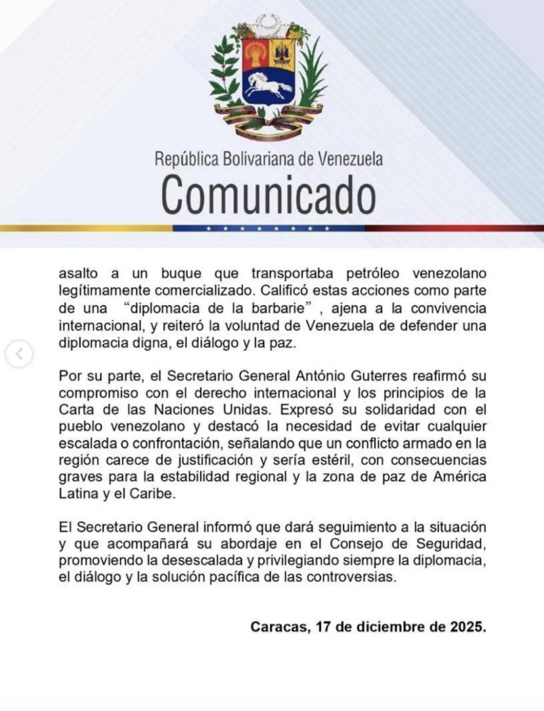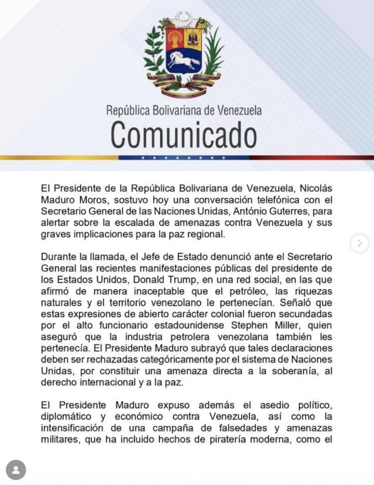 En esta misma conversación, el canciller subrayó que dichas declaraciones deben ser rechazadas de manera categórica por el sistema de Naciones Unidas, al considerar que constituyen una amenaza directa a la soberanía, al derecho internacional y a la paz. Bajo este contexto, el presidente Maduro calificó estas acciones como parte de una "campaña de falsedades" y de "amenazas militares". Cabe destacar que recientemente Washington anunció un "bloqueo total" a buques "sancionados" que transporten petróleo con destino a Caracas.