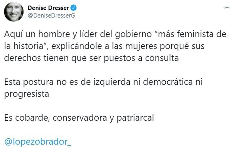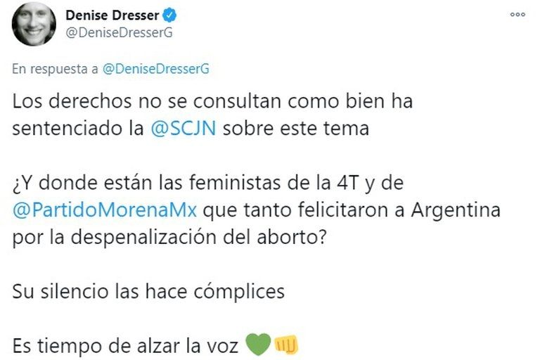 Los derechos no se consultan como bien ha sentenciado la @SCJN sobre este tema ¿Y dónde están las feministas de la 4T y de @PartidoMorenaMx que tanto felicitaron a Argentina por la despenalización del aborto? Su silencio las hace cómplices. Es tiempo de alzar la voz”, concluyó Dresser.