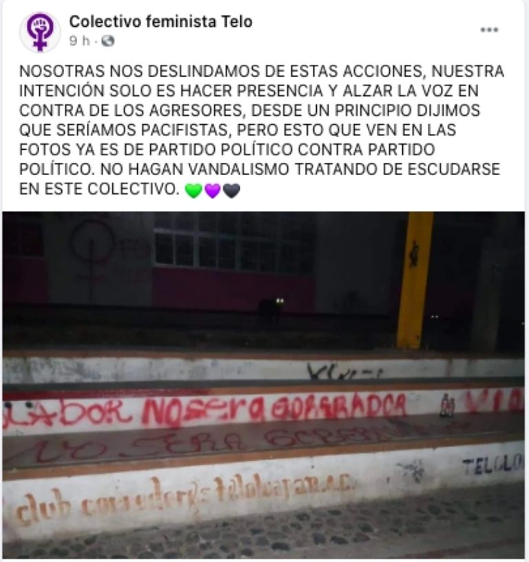 Sin embargo, a través de redes sociales el Colectivo Feminista Telo, difundió un comunicado en donde se deslinda de las pintas que se realizaron en el municipio antes mencionado en contra de la postulación de Salgado Macedonio.