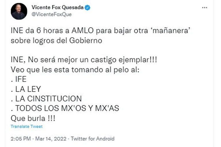 “INE da 6 horas a AMLO para bajar otra ‘mañanera’ sobre logros del Gobierno. INE, no será mejor un castigo ejemplar!! Veo que les está tomando al pelo al INE, la Ley, la Constitución, todos los mx’os y mx’as. Que burla!!”, escribió.