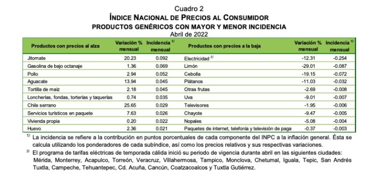 En contraste, los productos o servicios que mostraron un deceso durante la segunda quincena del mes de abril, los cuales ayudaron a que el INPC se mantuviera por debajo de las proyecciones del mercado, el cual mostraba que la tasa sería del 7.72% fueron: